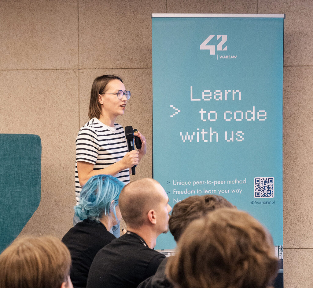42 Warsaw to akademia kodowania oparta na unikalnym modelu edukacji peer-to-peer. Bez tradycyjnych wykładów, podręczników czy nauczycieli. Poprzez pracę nad praktycznymi, rzeczywistymi projektami, osoby studiujące rozwijają zarówno umiejętności programistyczne, jak i kompetencje miękkie.
